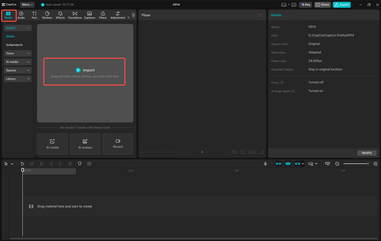 Start by opening CapCut PC and clicking on Create Project. The next thing to do is to click Import so that you can add your portrait photograph to the media library. To begin with, drag it to the editing timeline. Best to have a bright picture with a clear subject matter, one the natural daylight that is lit in a daylight or the soft light of artificial lighting will do the trick.