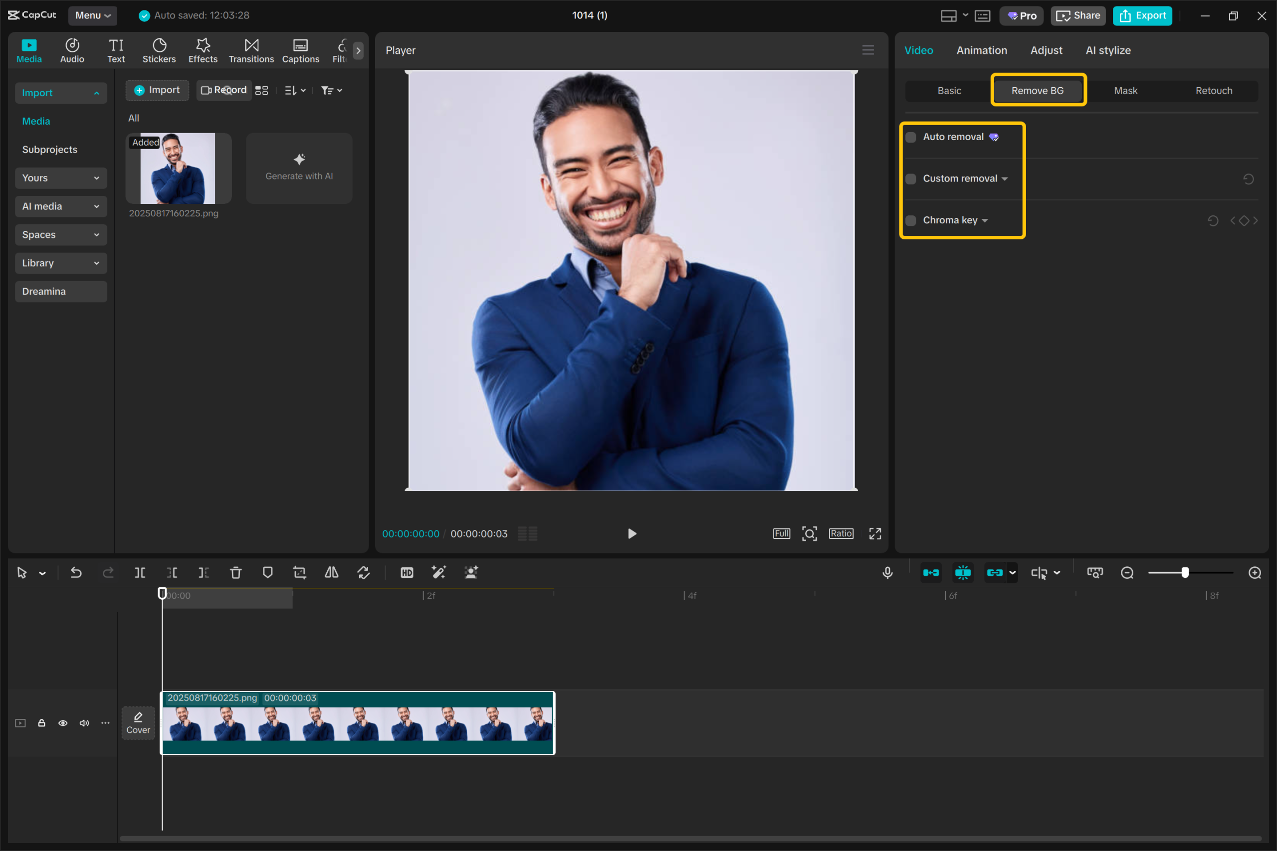 In the right side panel, under Image, select “Remove BG”, and choose “Auto removal”. The smart AI in CapCut automatically isolates your face and body from the background, eliminating any professional noise. Then you can apply such manual tools to have a smoother look and fix tiny details around clothes and hair to make the appearance more natural.